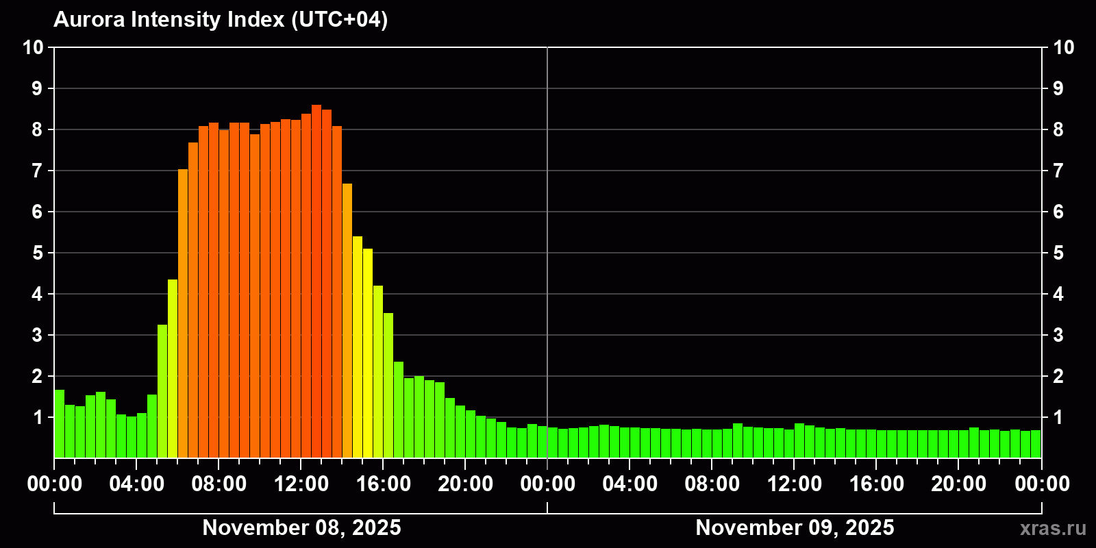Changes in the auroral intensity index from 2025-11-08 to 2025-11-09 local time
