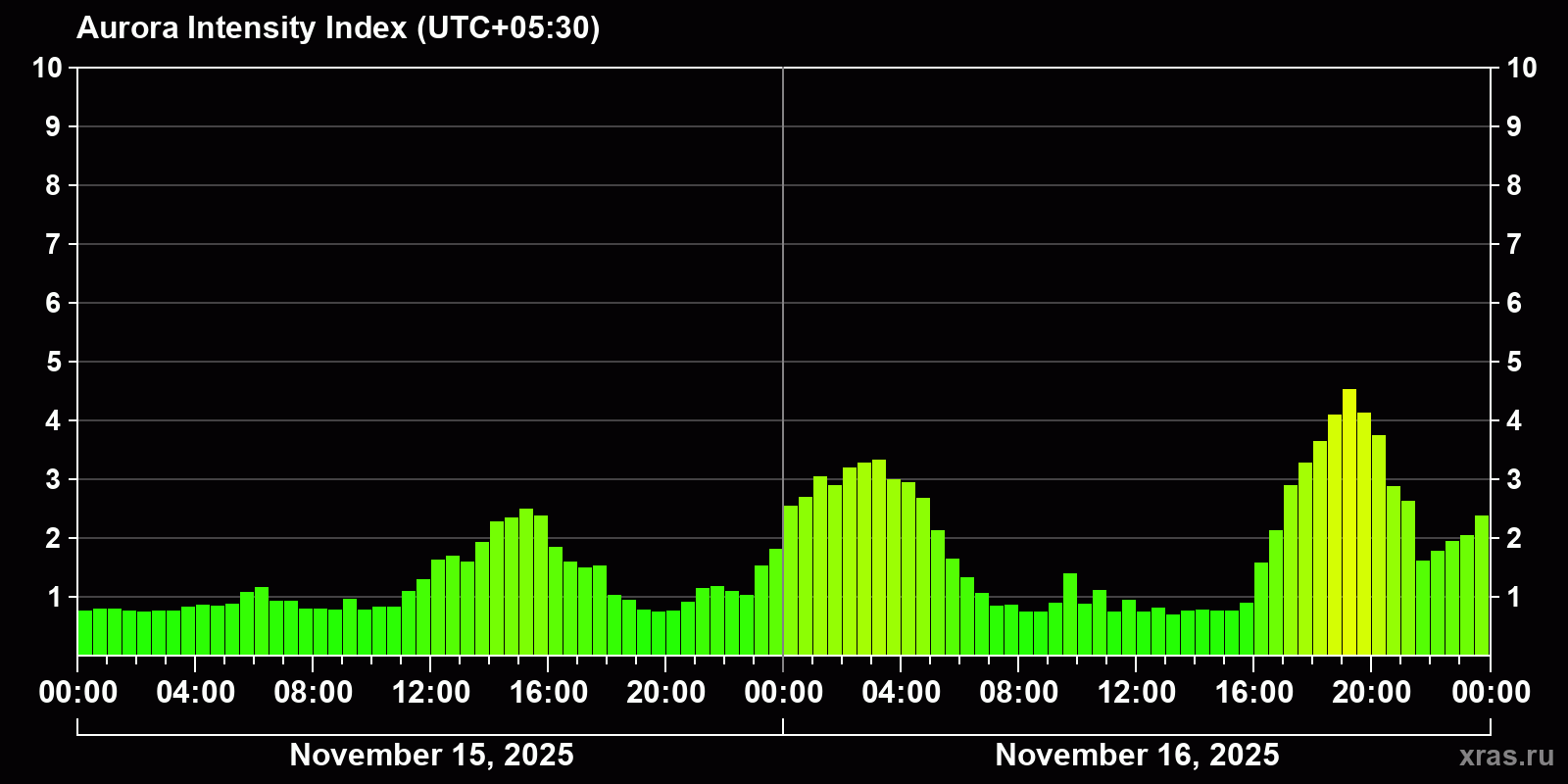 Auroral intensity index and the theoretically possible latitude of observations for nighttime in the Estern Hemisphere as of 2025-11-16 23:55 (end of day) local time