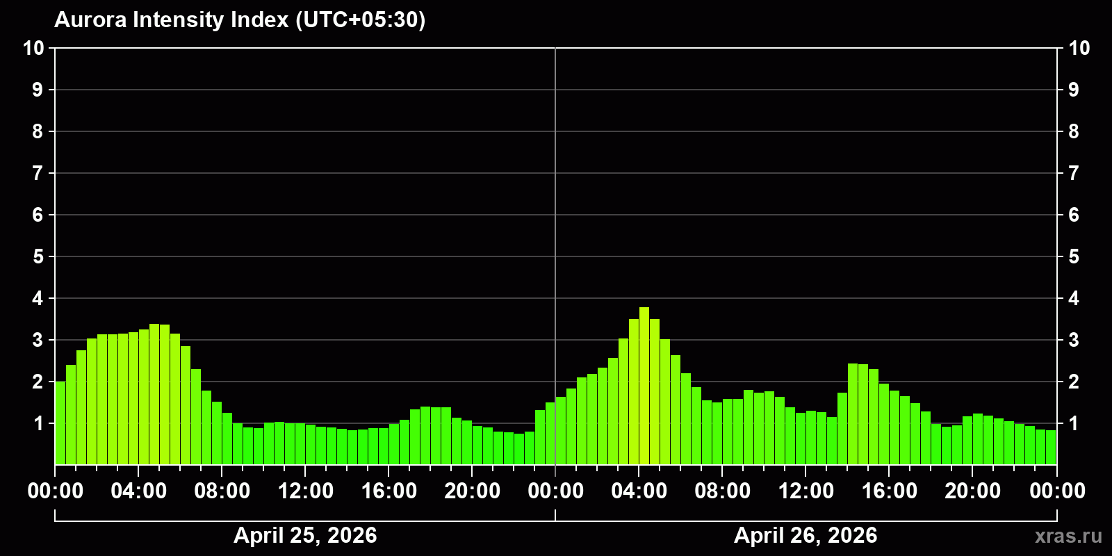 Auroral intensity index and the theoretically possible latitude of observations for nighttime in the Estern Hemisphere as of 2026-04-26 23:45 (end of day) local time