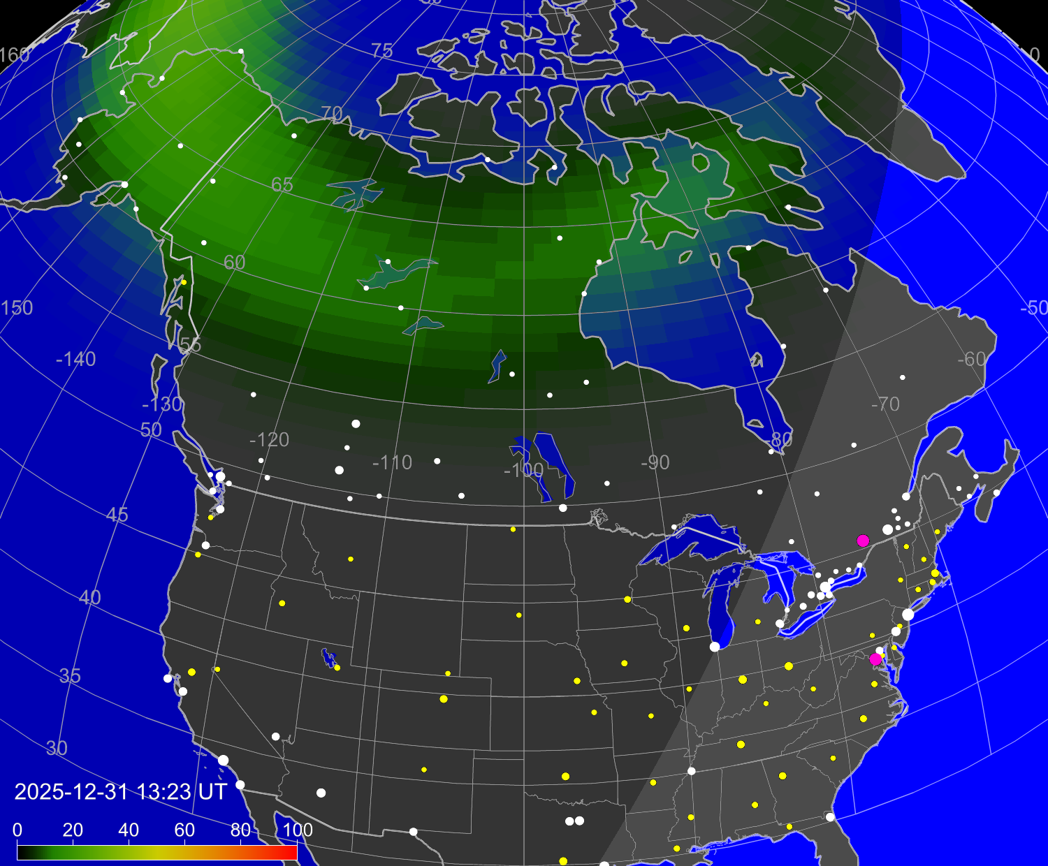 Вероятность полярных сияний в городах США