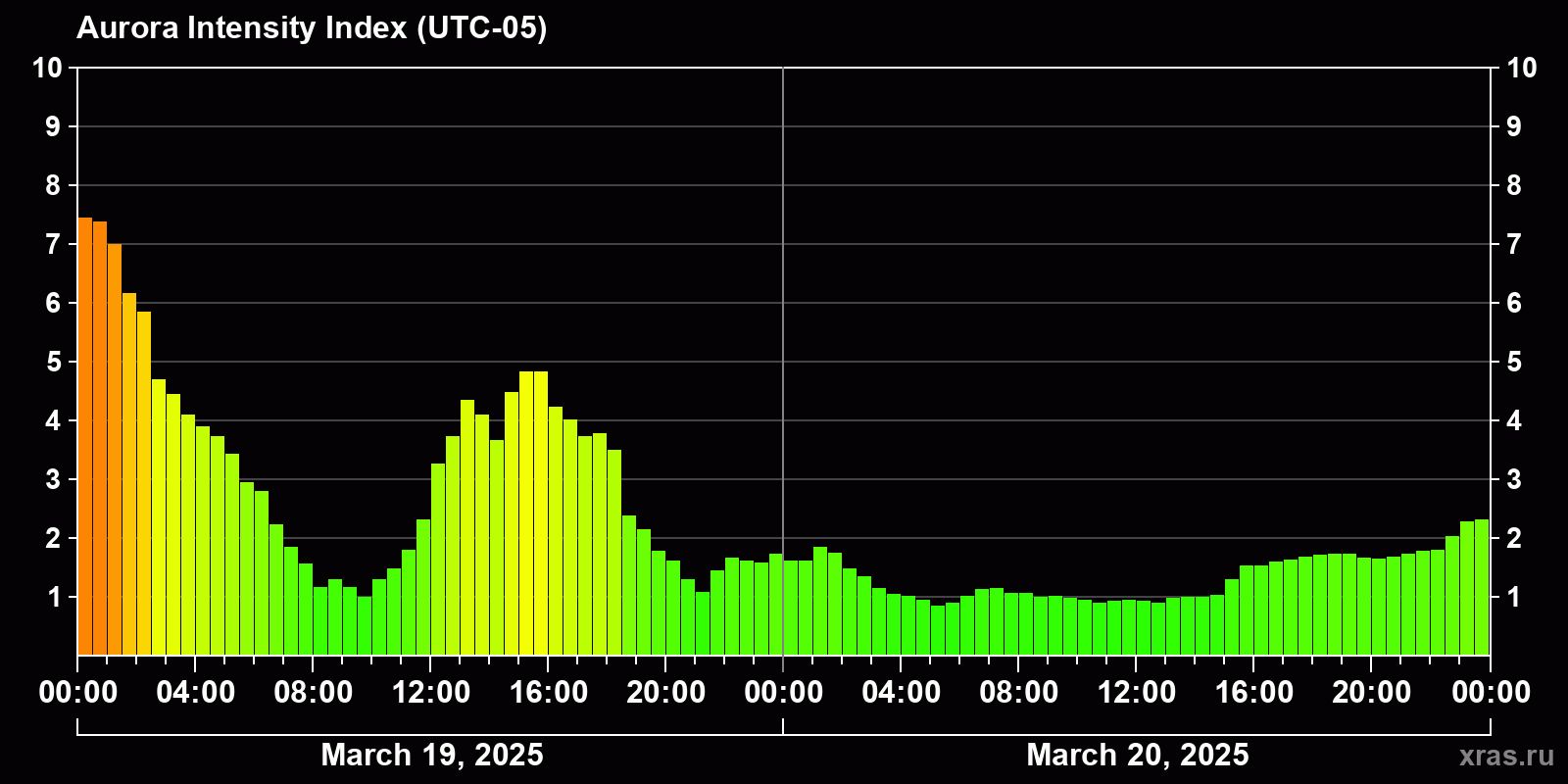 Auroral intensity index and the theoretically possible latitude of observations for nighttime in the Western Hemisphere as of 2025-03-20 23:54 (end of day) local time