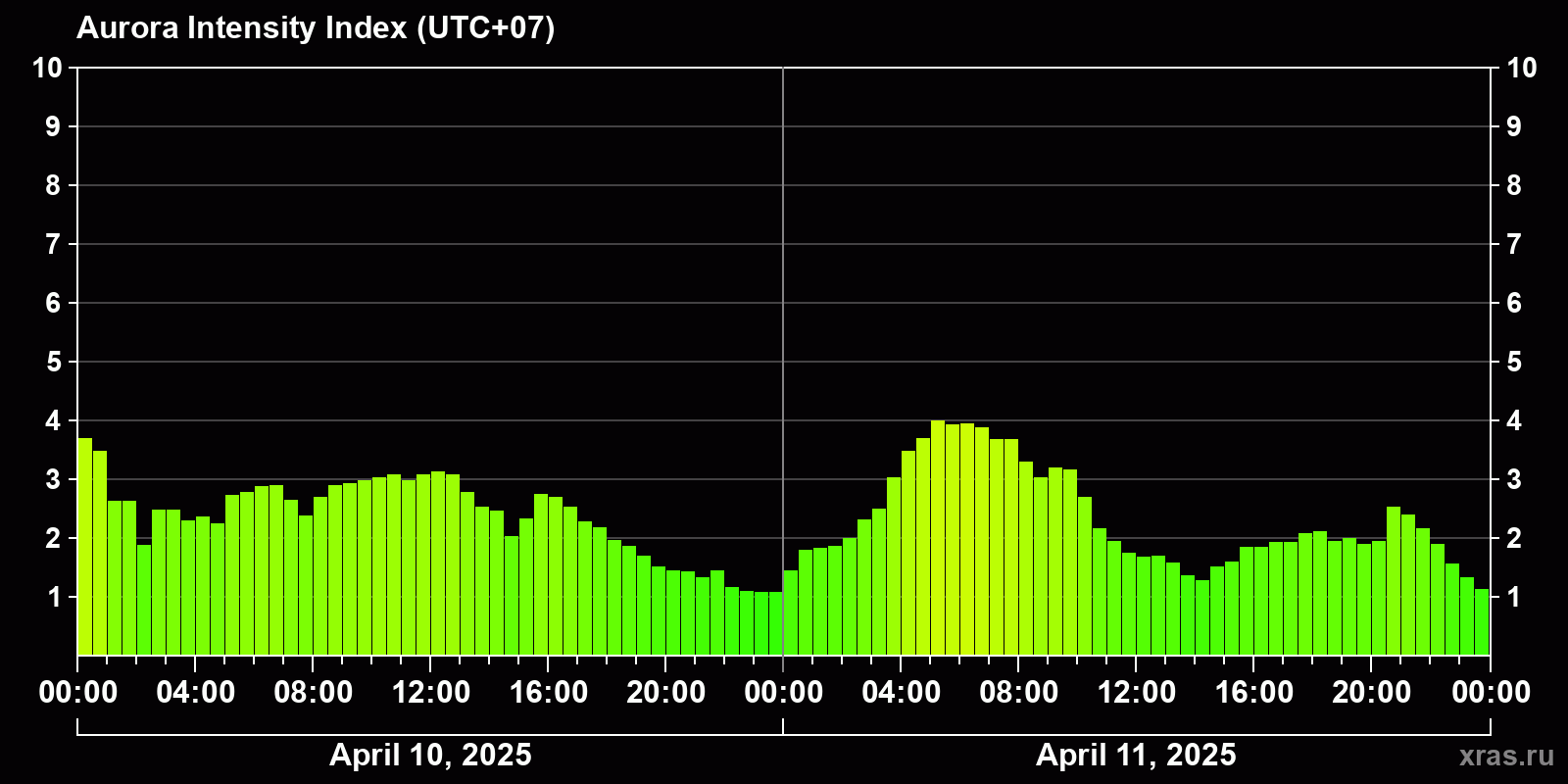 Changes in the auroral intensity index from 2025-04-10 to 2025-04-11 local time