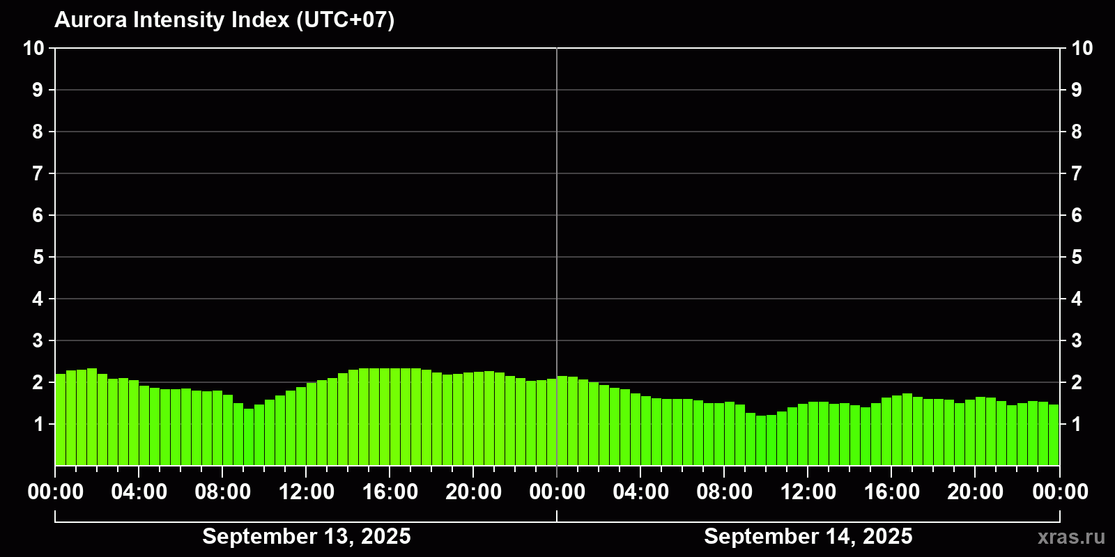 Changes in the auroral intensity index from 2025-09-13 to 2025-09-14 local time