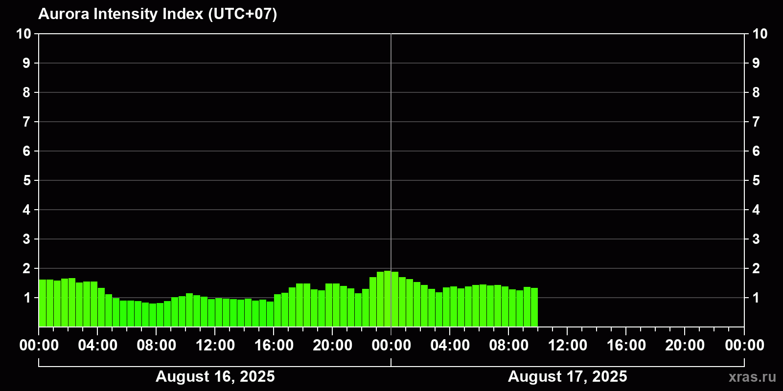 Auroral intensity index and the theoretically possible latitude of observations for nighttime in the Estern Hemisphere as of 2025-08-17 09:47 (end of day) local time