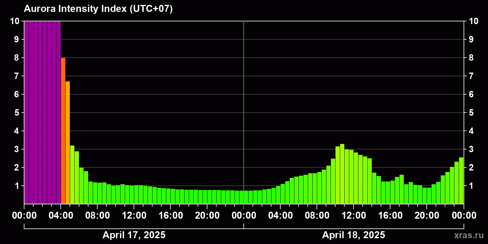 Changes in the auroral intensity index from 2025-04-17 to 2025-04-18 local time