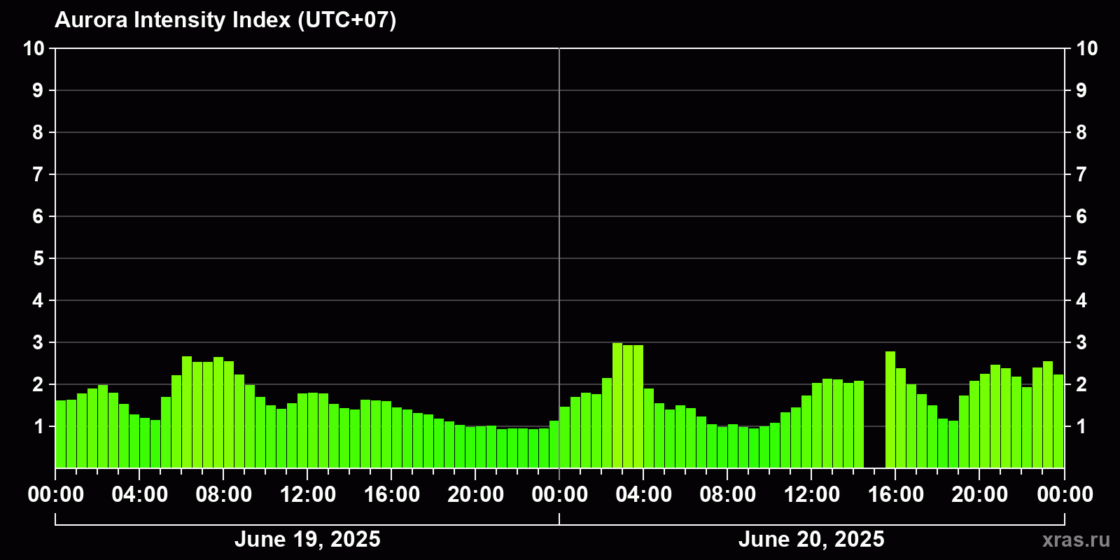 Auroral intensity index and the theoretically possible latitude of observations for nighttime in the Estern Hemisphere as of 2025-06-20 23:44 (end of day) local time
