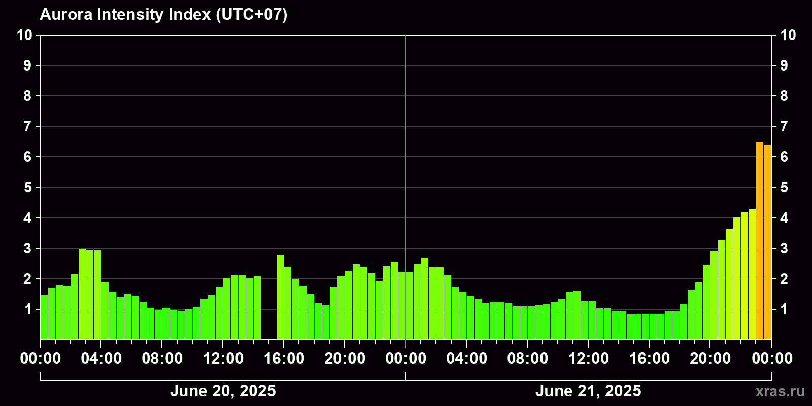 Changes in the auroral intensity index from 2025-06-20 to 2025-06-21 local time