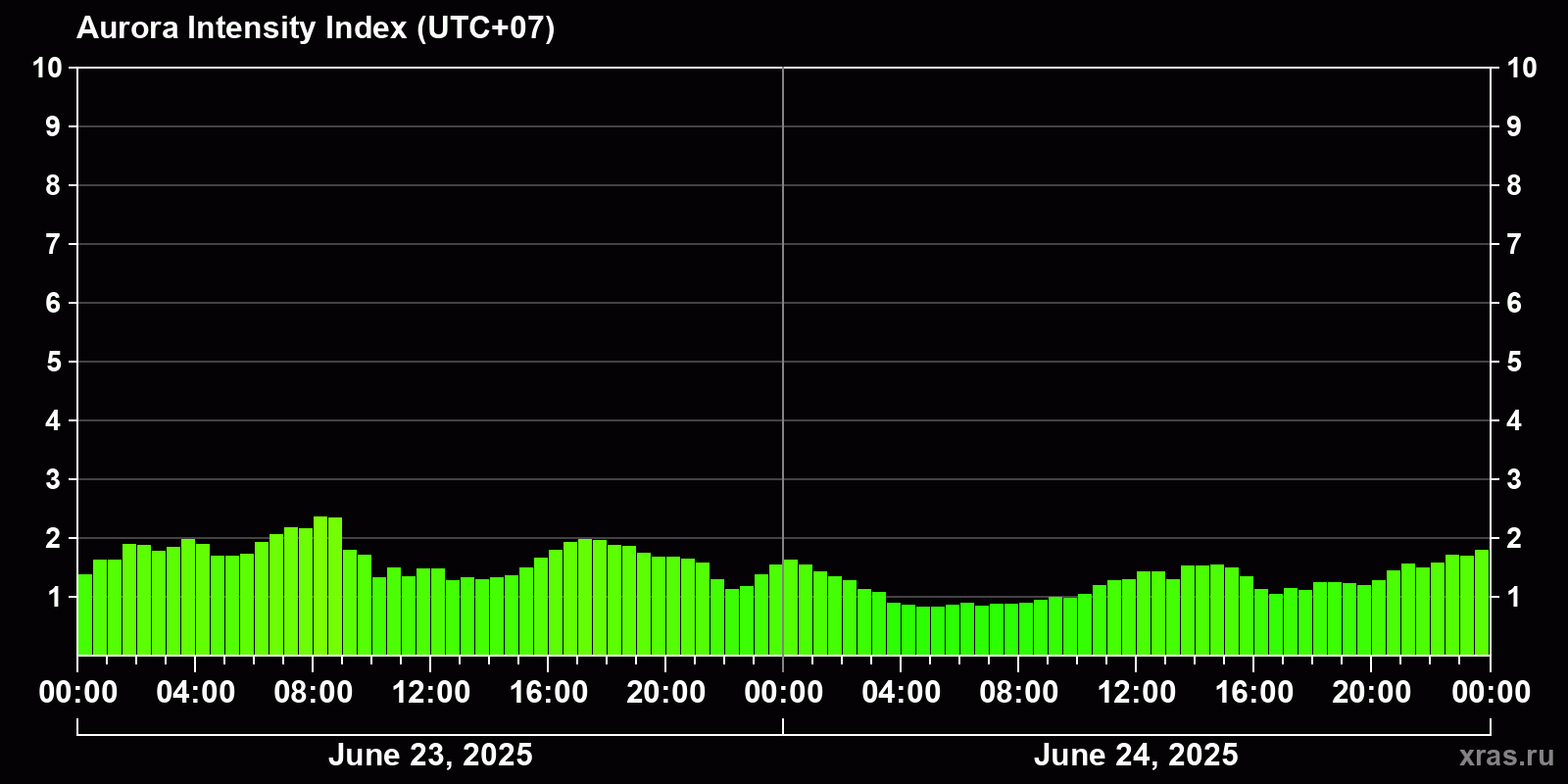 Auroral intensity index and the theoretically possible latitude of observations for nighttime in the Estern Hemisphere as of 2025-06-24 23:58 (end of day) local time