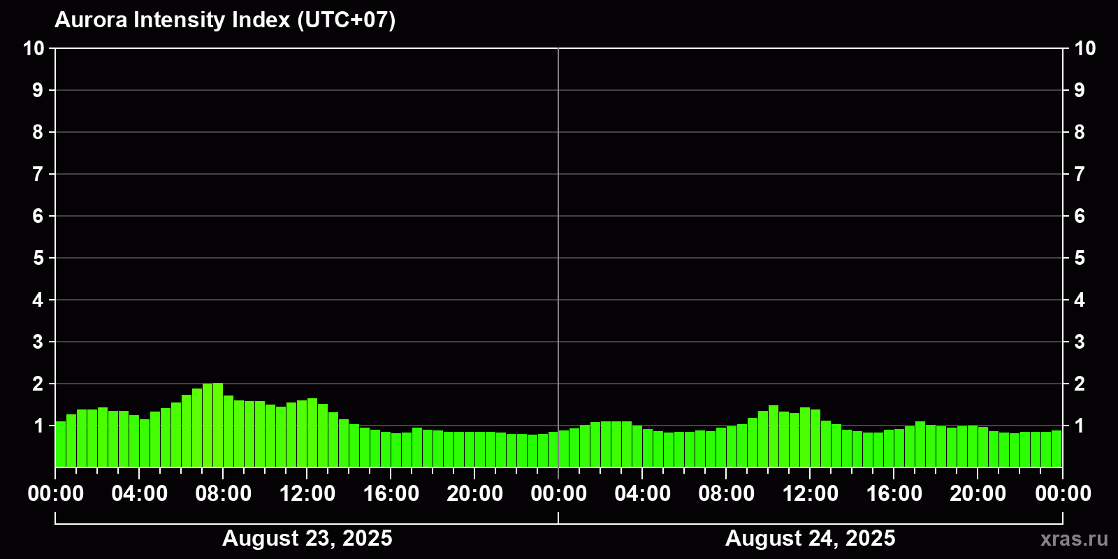 Auroral intensity index and the theoretically possible latitude of observations for nighttime in the Estern Hemisphere as of 2025-08-24 23:45 (end of day) local time
