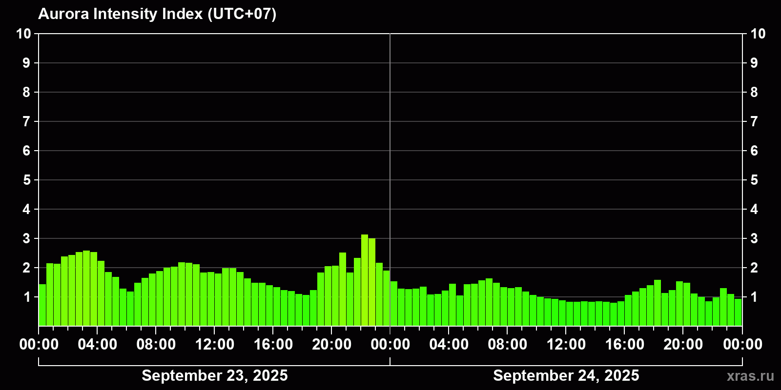 Auroral intensity index and the theoretically possible latitude of observations for nighttime in the Estern Hemisphere as of 2025-09-24 23:54 (end of day) local time