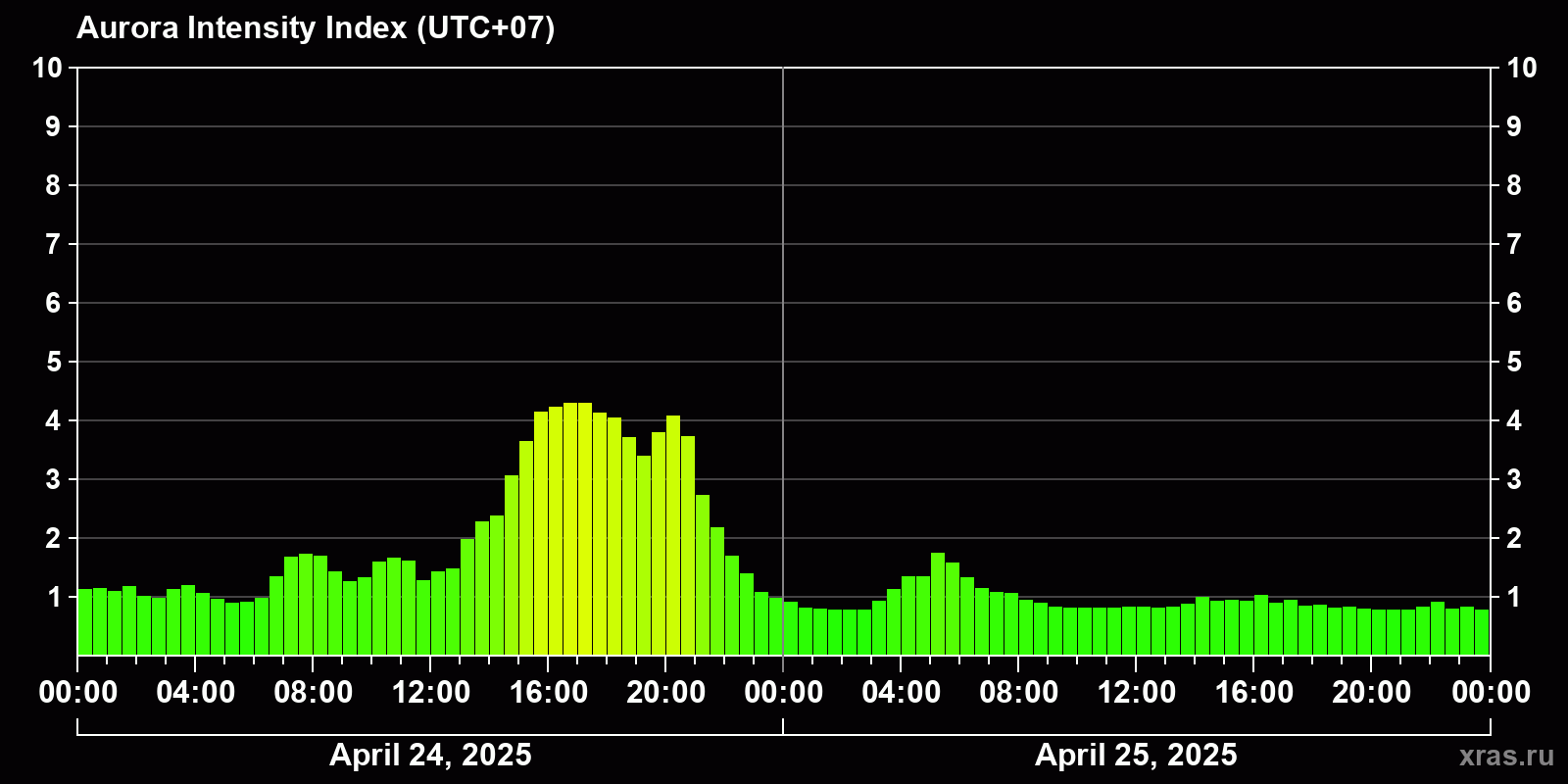 Auroral intensity index and the theoretically possible latitude of observations for nighttime in the Estern Hemisphere as of 2025-04-25 23:55 (end of day) local time