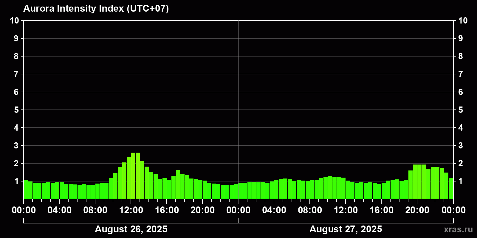 Changes in the auroral intensity index from 2025-08-26 to 2025-08-27 local time