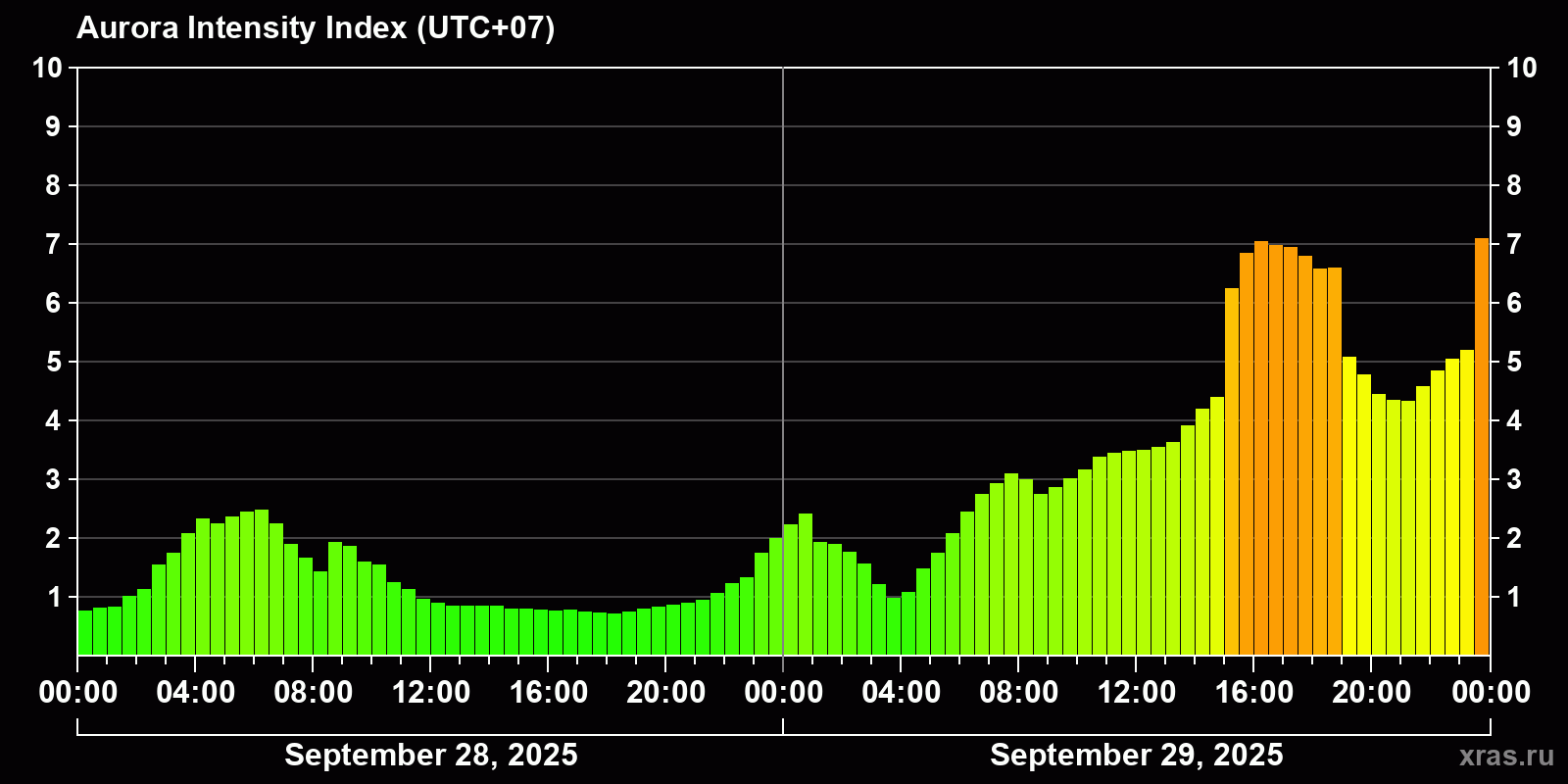 Auroral intensity index and the theoretically possible latitude of observations for nighttime in the Estern Hemisphere as of 2025-09-29 23:47 (end of day) local time