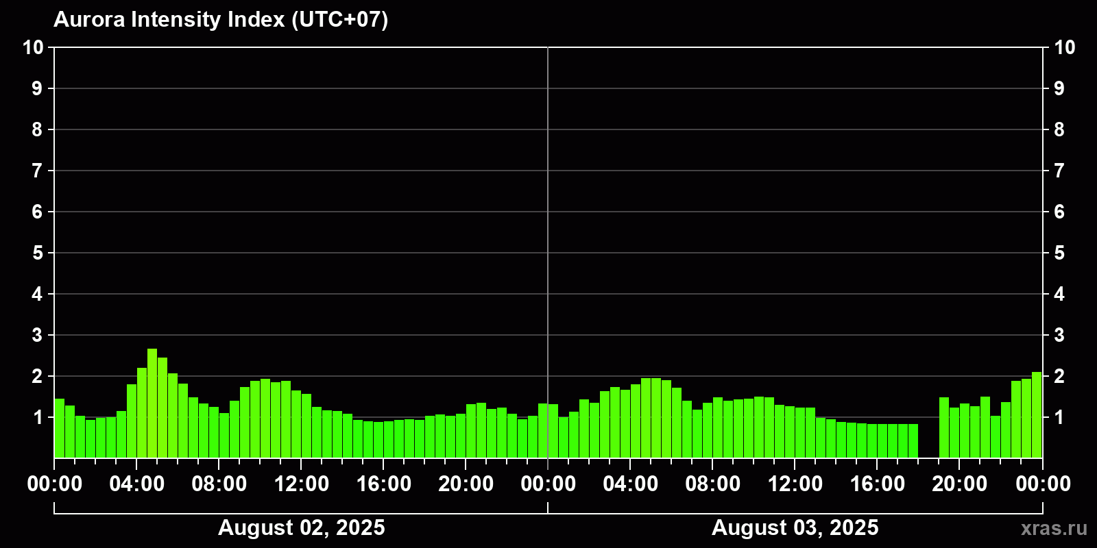 Changes in the auroral intensity index from 2025-08-02 to 2025-08-03 local time