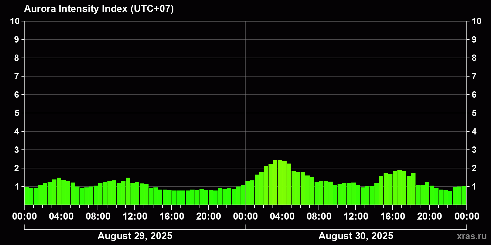 Auroral intensity index and the theoretically possible latitude of observations for nighttime in the Estern Hemisphere as of 2025-08-30 23:54 (end of day) local time