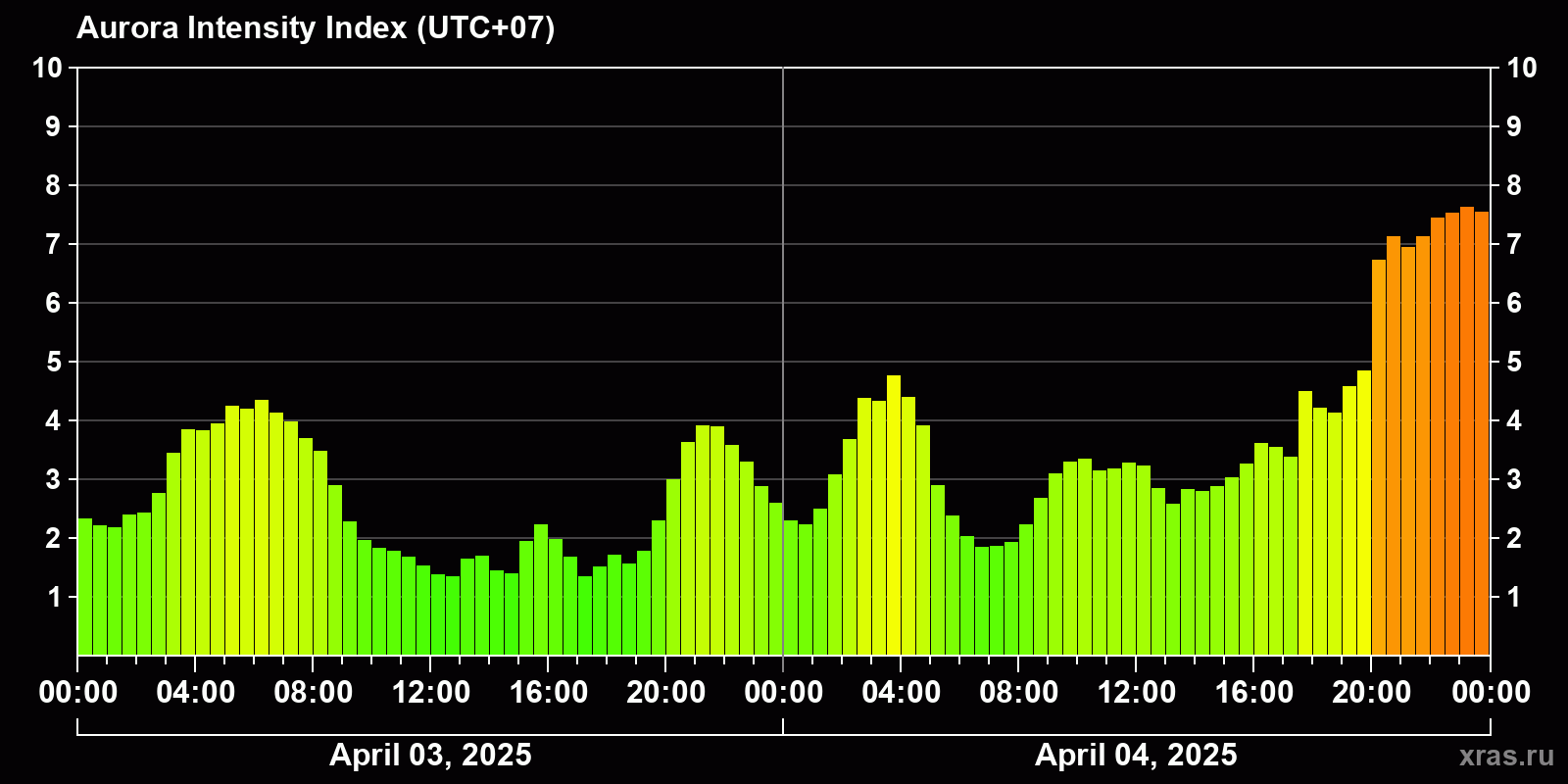 Changes in the auroral intensity index from 2025-04-03 to 2025-04-04 local time