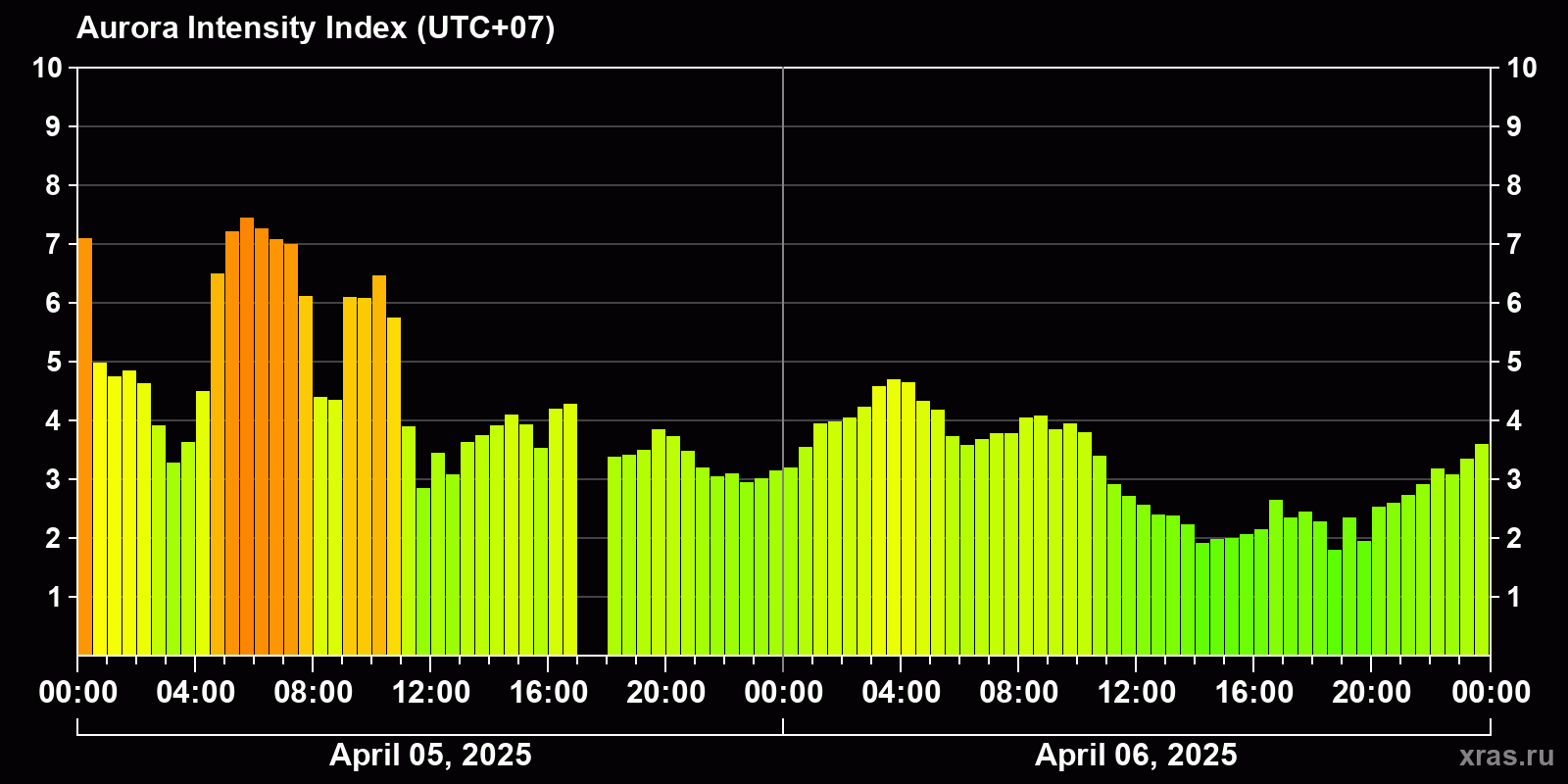 Auroral intensity index and the theoretically possible latitude of observations for nighttime in the Estern Hemisphere as of 2025-04-06 23:59 (end of day) local time