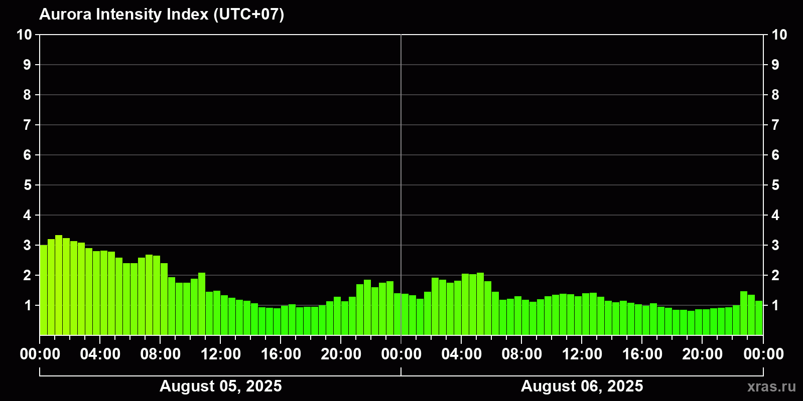 Auroral intensity index and the theoretically possible latitude of observations for nighttime in the Estern Hemisphere as of 2025-08-06 23:53 (end of day) local time