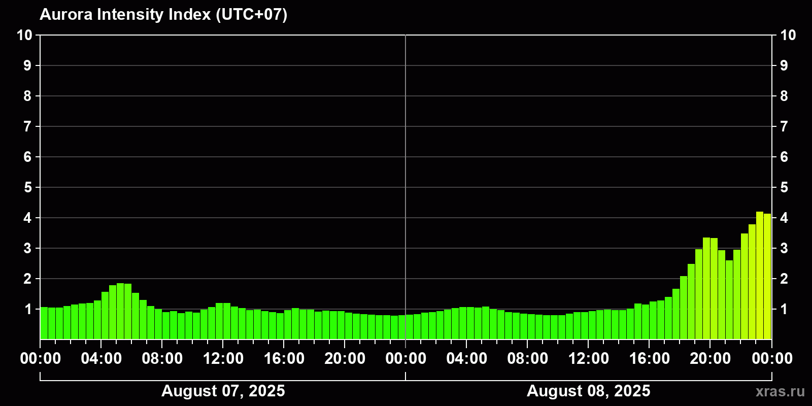 Changes in the auroral intensity index from 2025-08-07 to 2025-08-08 local time