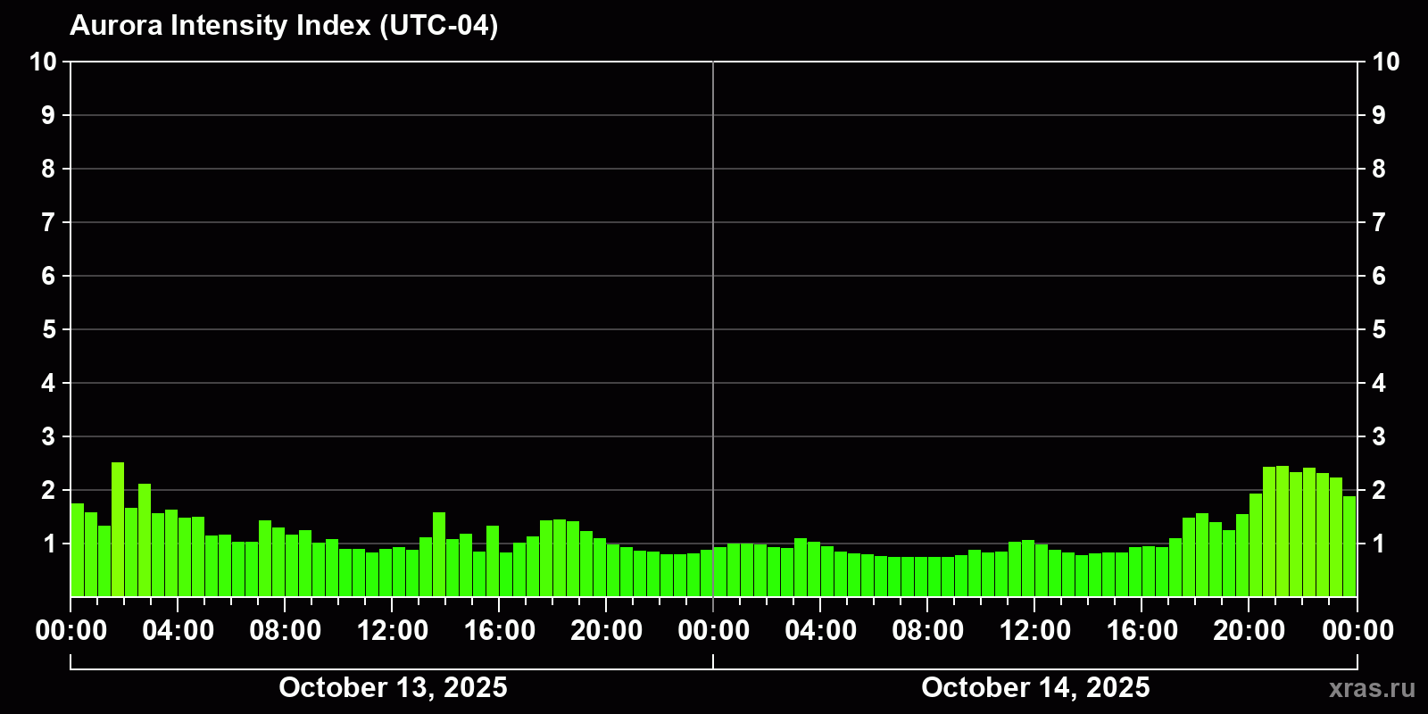 Auroral intensity index and the theoretically possible latitude of observations for nighttime in the Western Hemisphere as of 2025-10-14 23:59 (end of day) local time