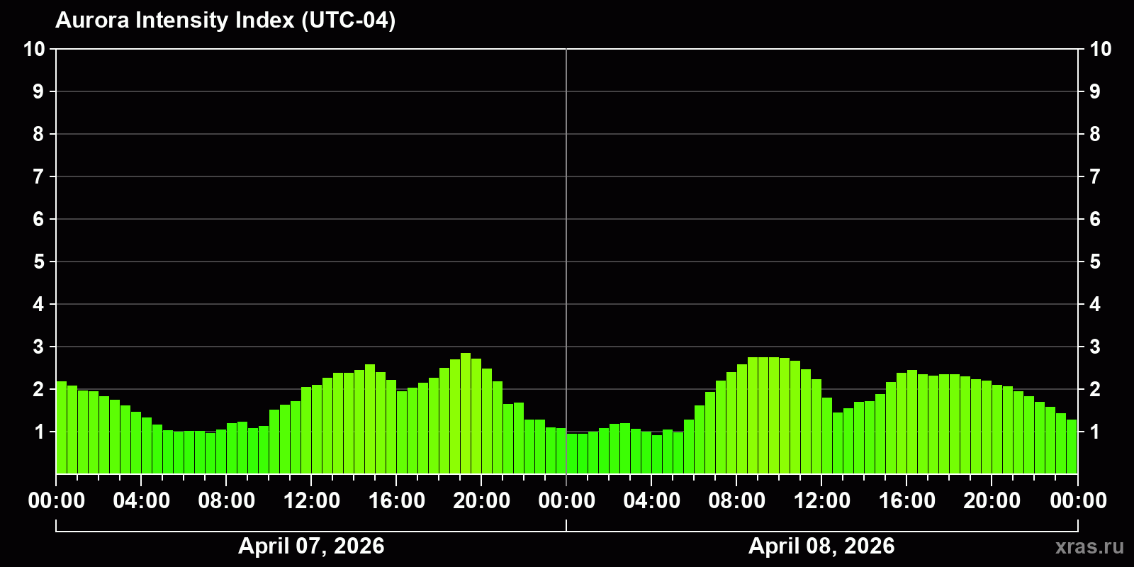 Auroral intensity index and the theoretically possible latitude of observations for nighttime in the Western Hemisphere as of 2026-04-08 23:52 (end of day) local time