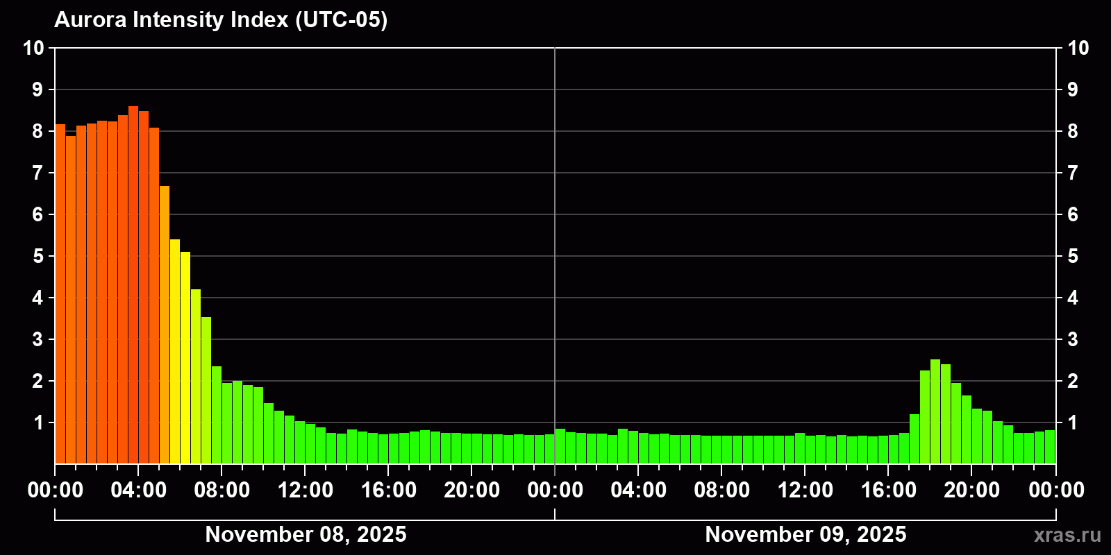 Changes in the auroral intensity index from 2025-11-08 to 2025-11-09 local time