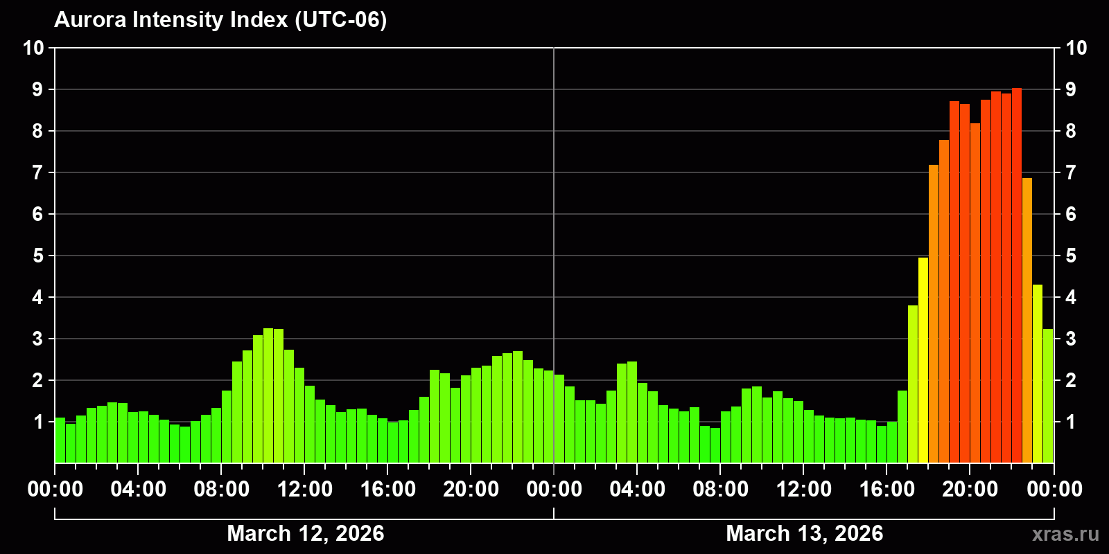 Changes in the auroral intensity index from 2026-03-12 to 2026-03-13 local time