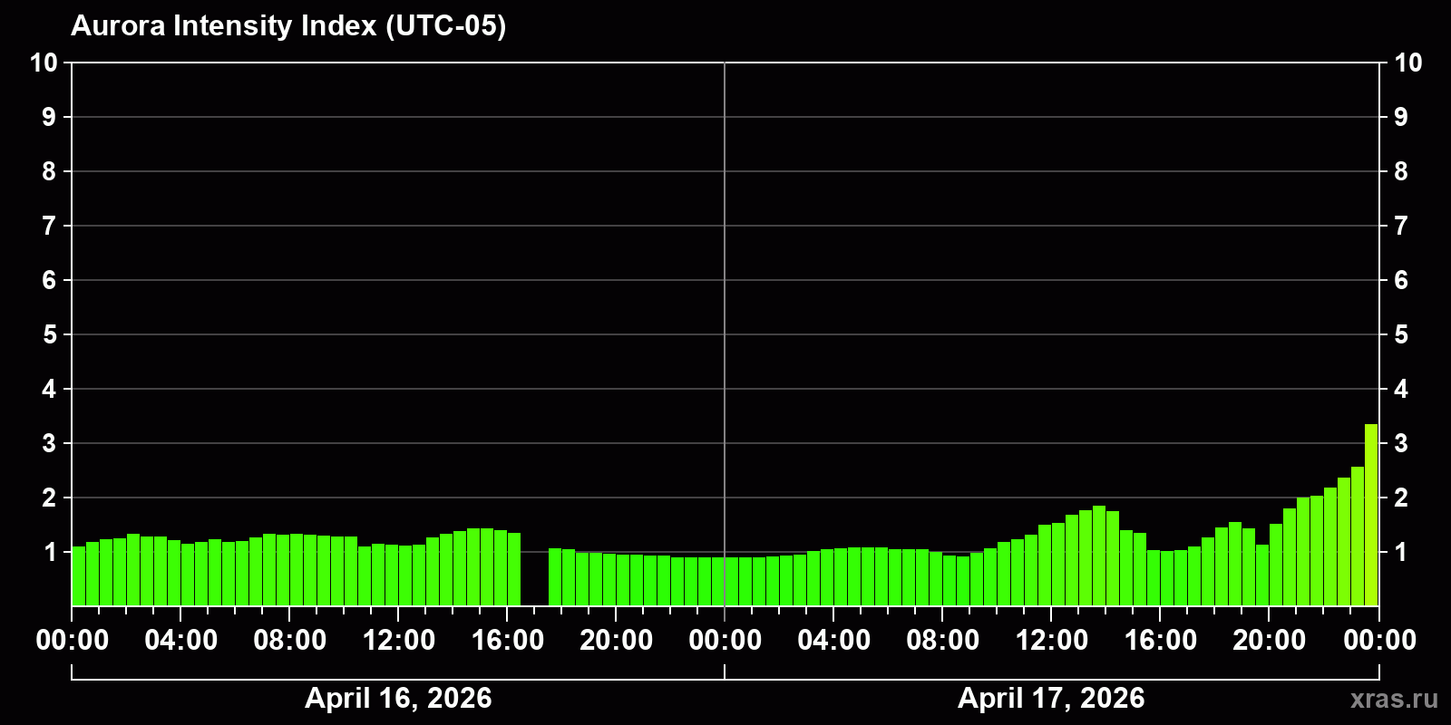 Auroral intensity index and the theoretically possible latitude of observations for nighttime in the Western Hemisphere as of 2026-04-17 23:58 (end of day) local time