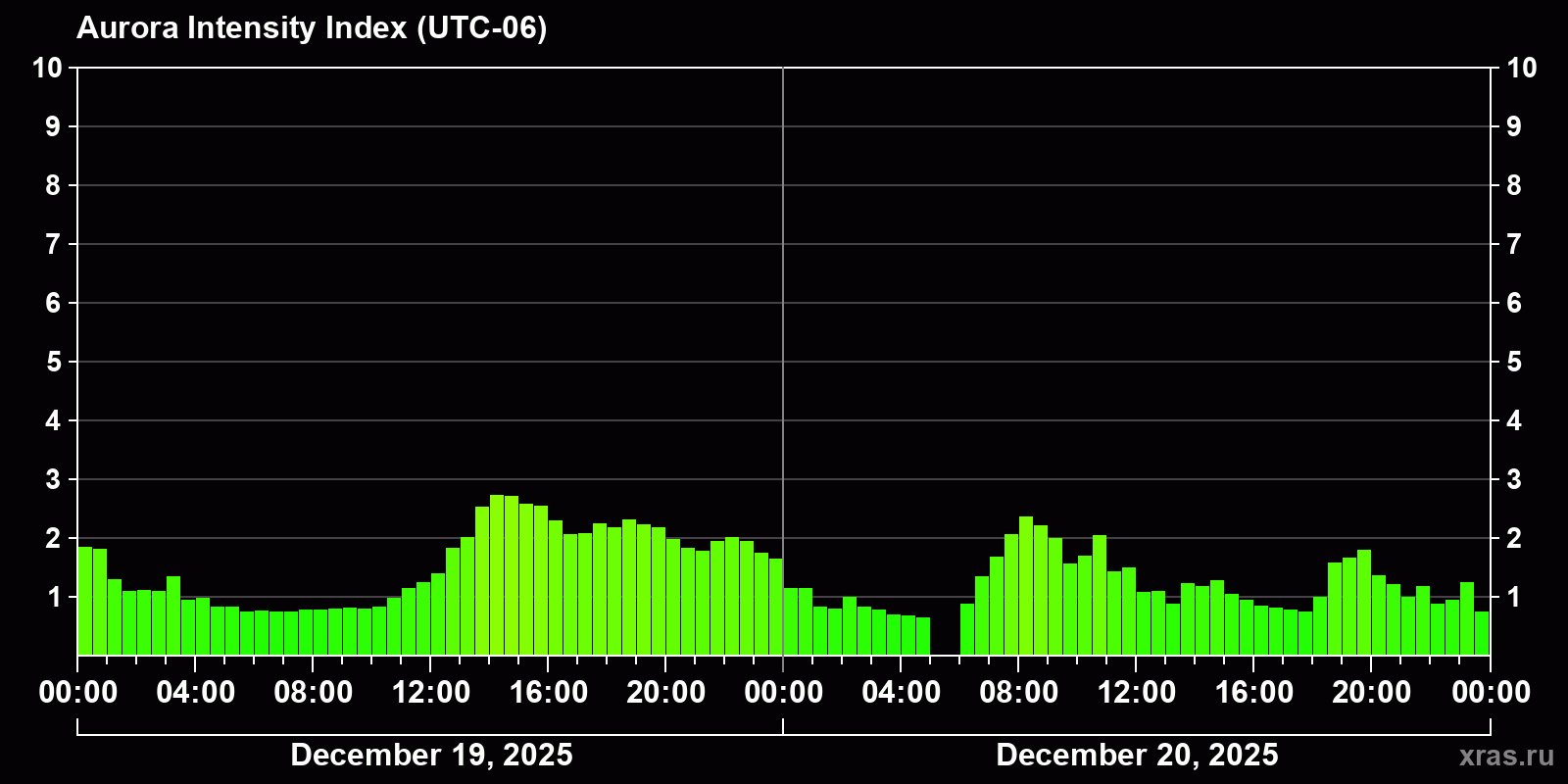 Changes in the auroral intensity index from 2025-12-19 to 2025-12-20 local time