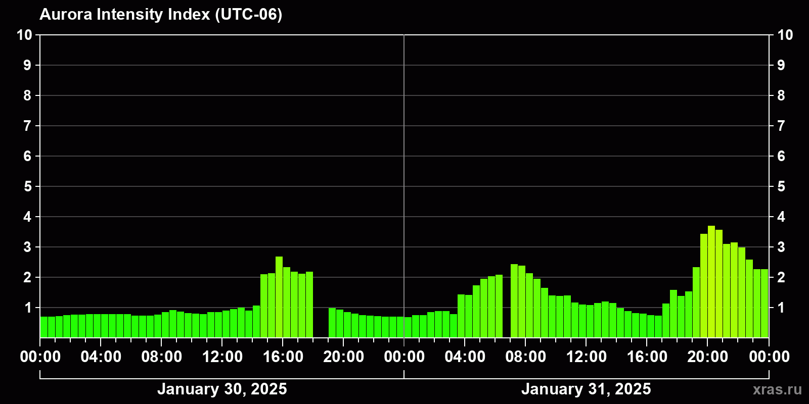 Changes in the auroral intensity index from 2025-01-30 to 2025-01-31 local time