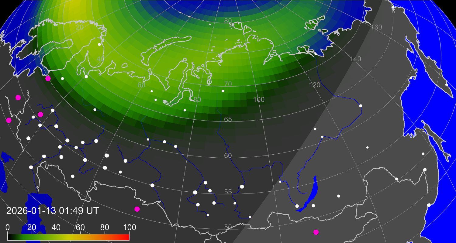 Изменения и часовой прогноз индекса интенсивности полярных сияний с 2026-01-12 по 2026-01-13