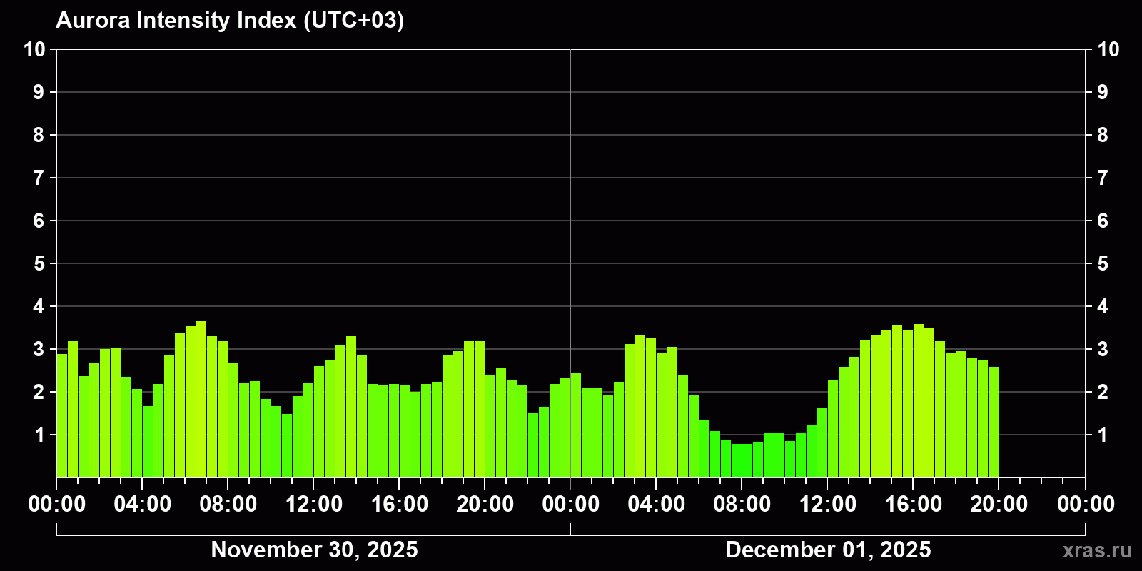 Auroral intensity index and the theoretically possible latitude of observations for nighttime in the Estern Hemisphere as of 2025-12-01 17:50 (end of day) local time