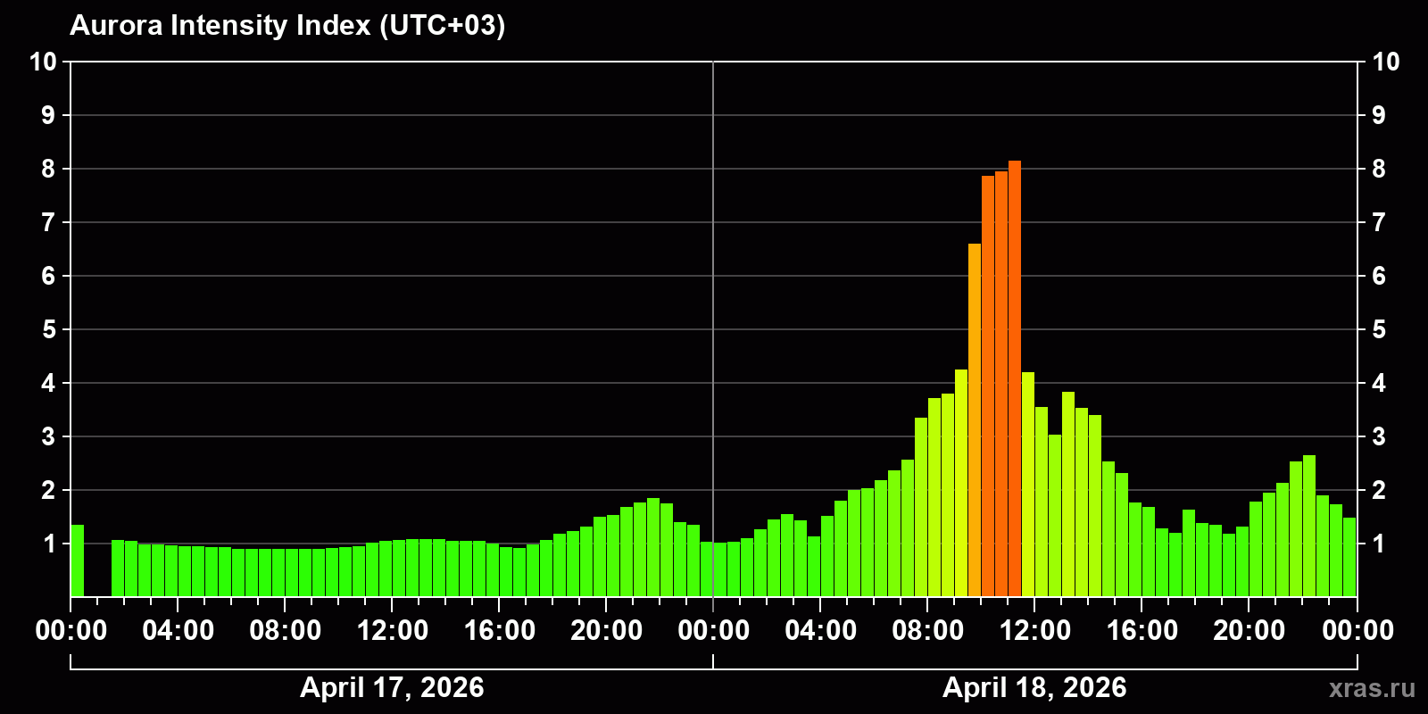 Changes in the auroral intensity index from 2026-04-17 to 2026-04-18 local time