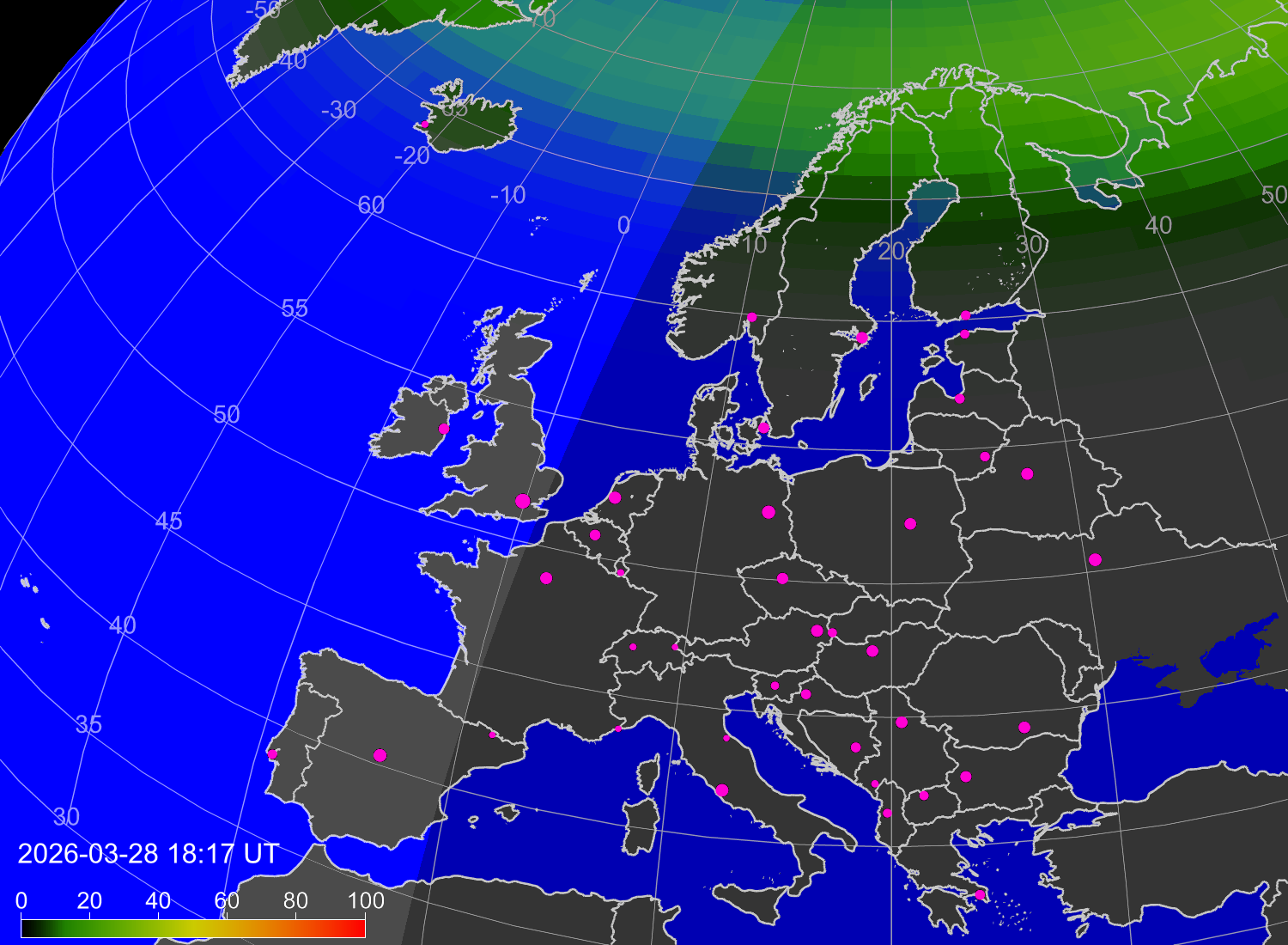 Вероятность полярных сияний в городах Европы