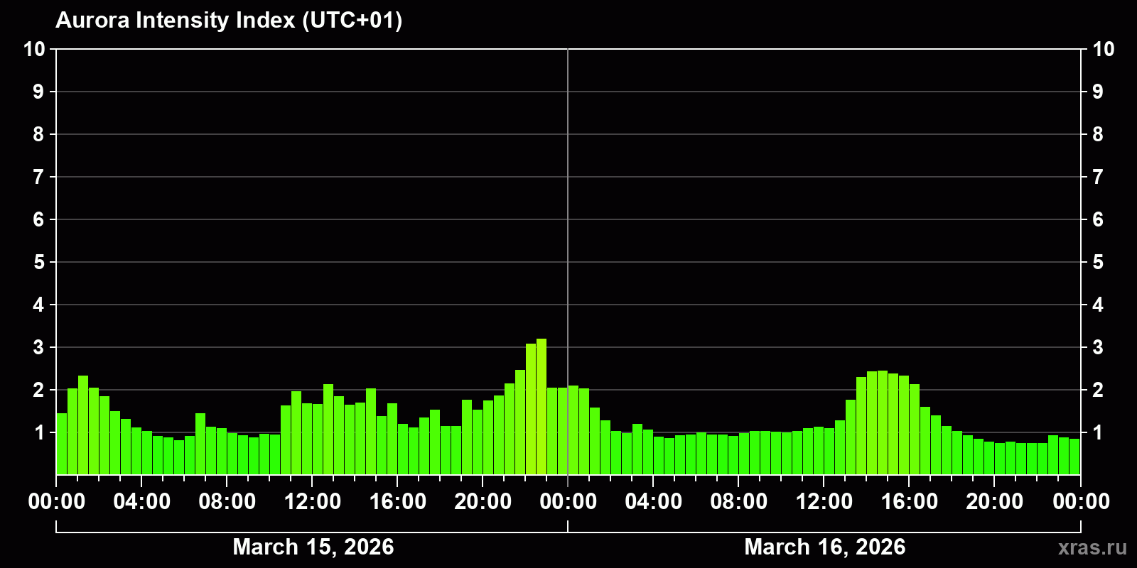 Changes in the auroral intensity index from 2026-03-15 to 2026-03-16 local time