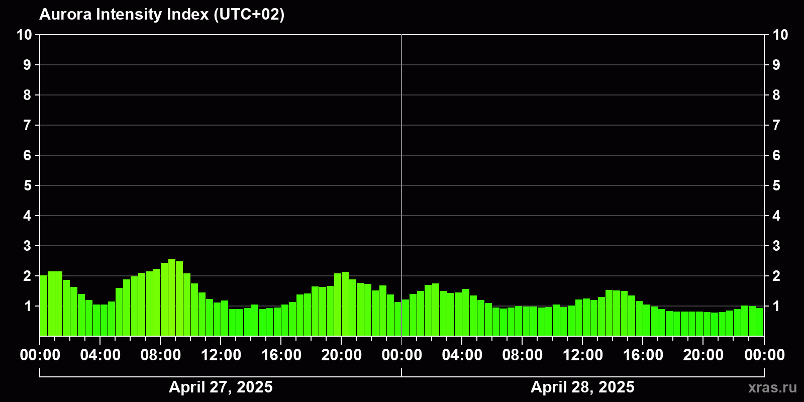 Auroral intensity index and the theoretically possible latitude of observations for nighttime in the Estern Hemisphere as of 2025-04-28 23:58 (end of day) local time