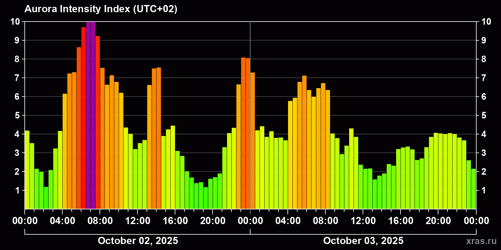 Changes in the auroral intensity index from 2025-10-02 to 2025-10-03 local time