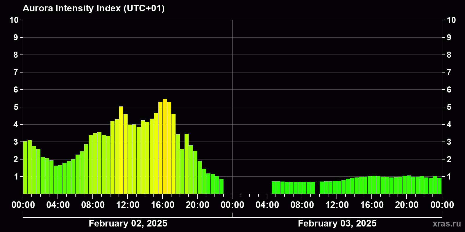 Changes in the auroral intensity index from 2025-02-02 to 2025-02-03 local time