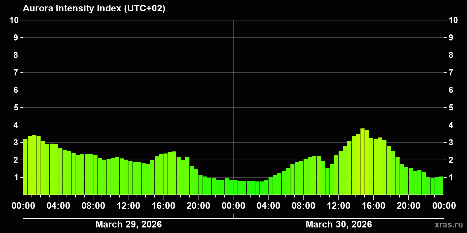 Auroral intensity index and the theoretically possible latitude of observations for nighttime in the Estern Hemisphere as of 2026-03-30 23:50 (end of day) local time
