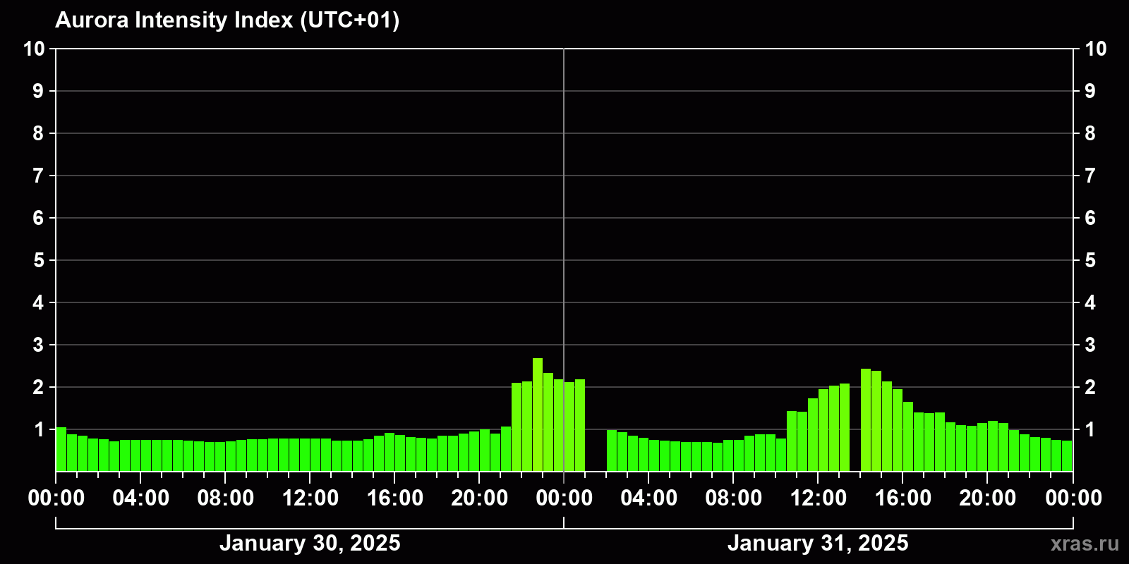 Changes in the auroral intensity index from 2025-01-30 to 2025-01-31 local time