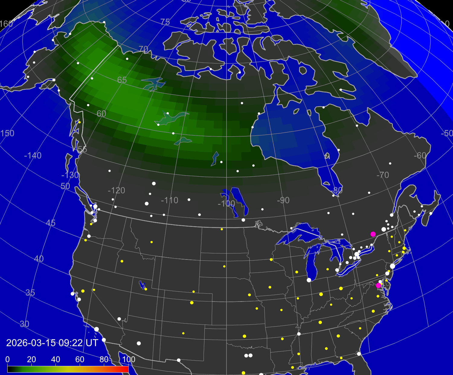 Зона полярных (северных) сияний над территорией Северной Америки