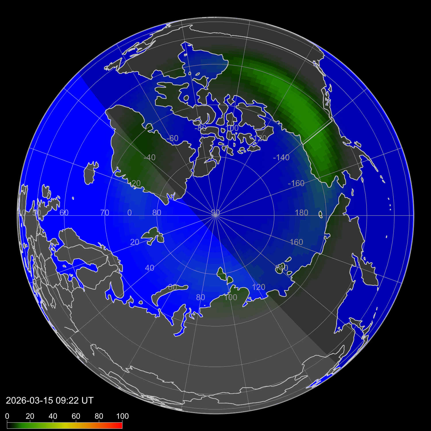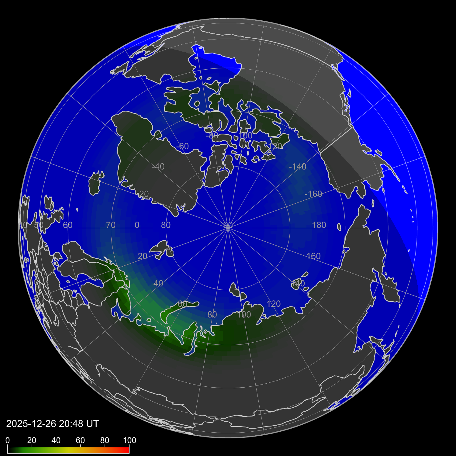 Индекс интенсивности полярных сияний и теоретически возможная широта наблюдений для ночного времени в западном полушарии
