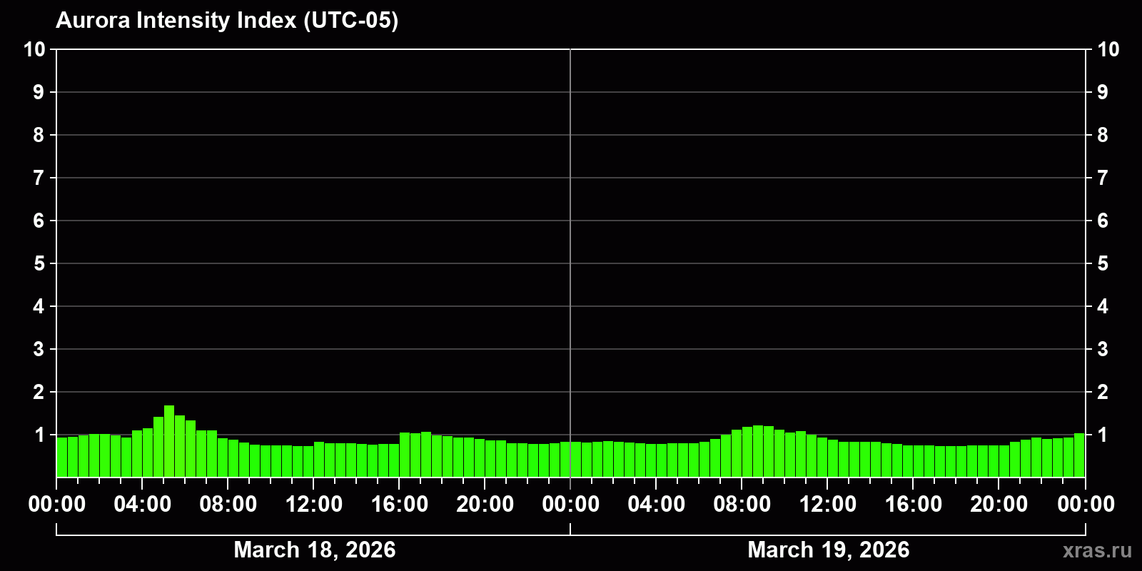 Changes in the auroral intensity index from 2026-03-18 to 2026-03-19 local time