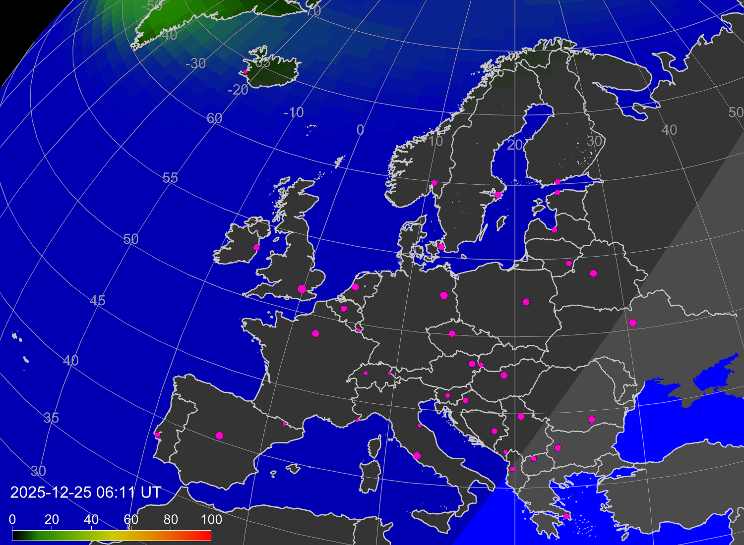 Вероятность полярных сияний в городах Европы