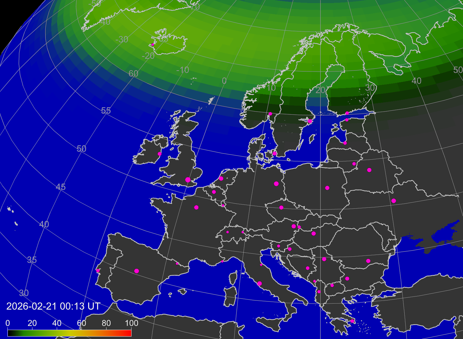 Индекс интенсивности полярных сияний и теоретически возможная широта наблюдений для ночного времени в восточном полушарии