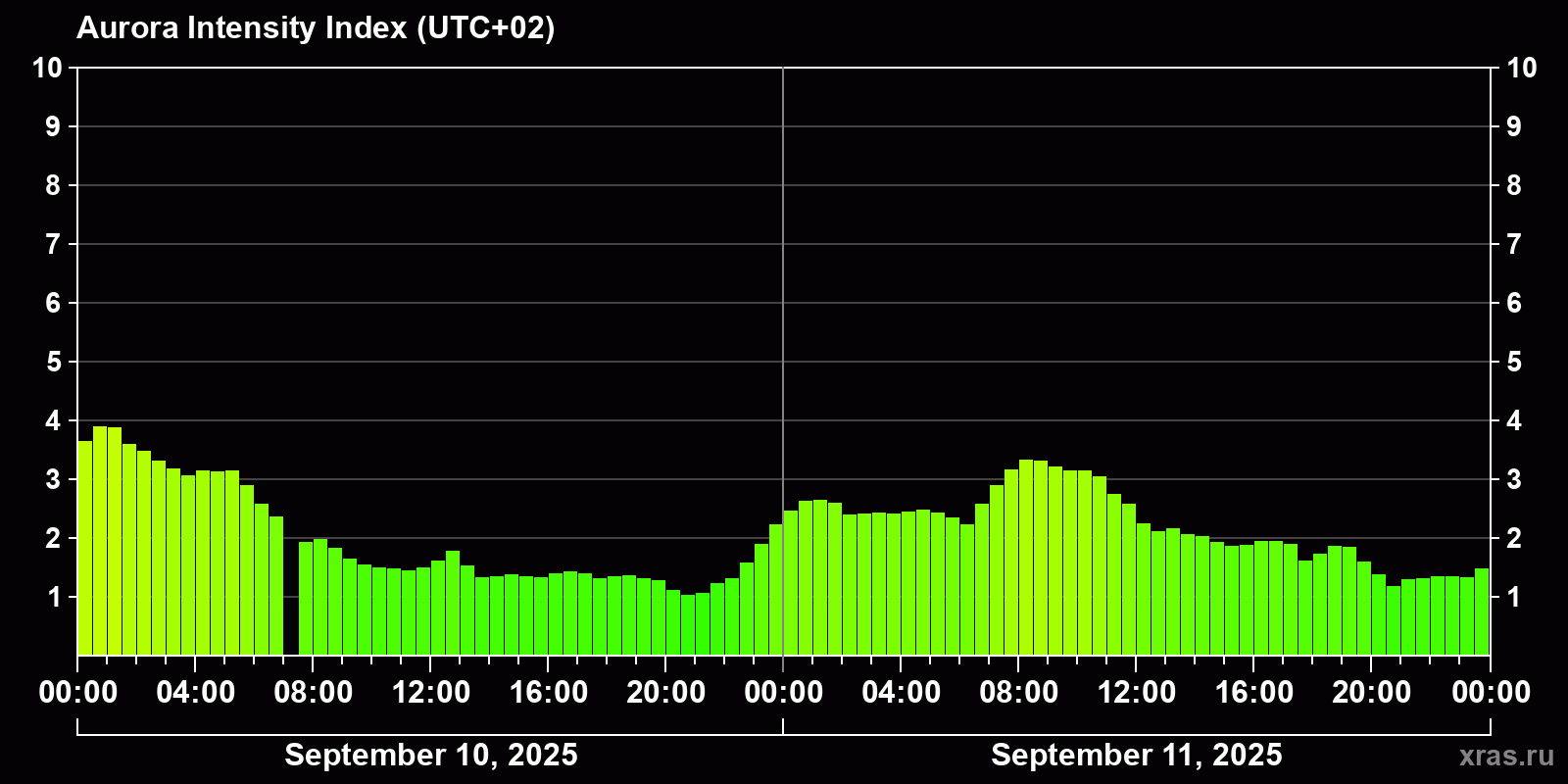 Changes in the auroral intensity index from 2025-09-10 to 2025-09-11 local time