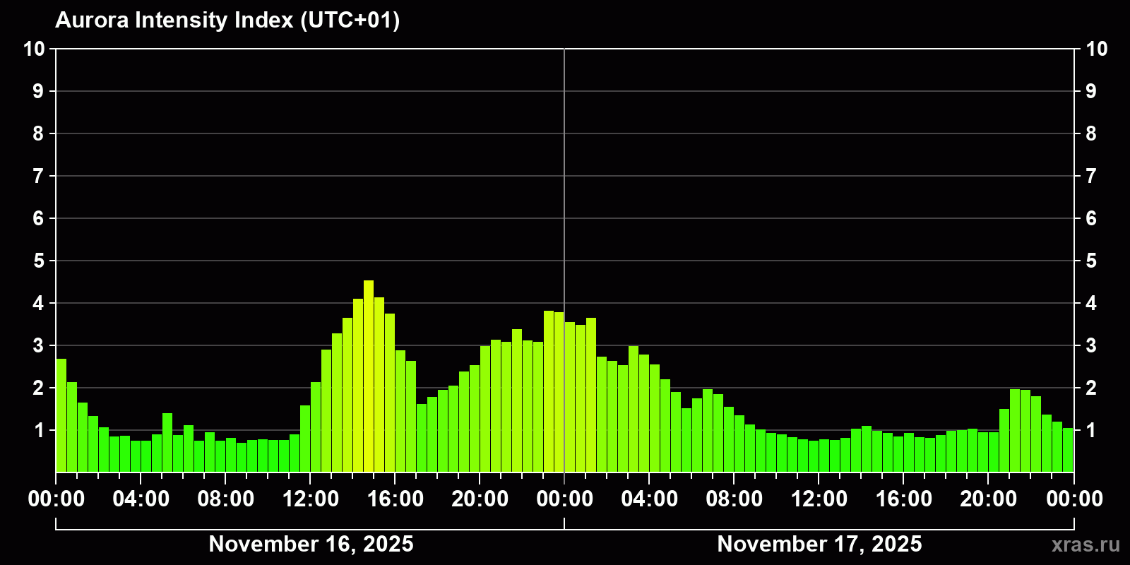 Changes in the auroral intensity index from 2025-11-16 to 2025-11-17 local time