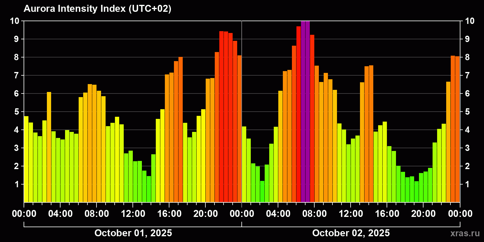 Auroral intensity index and the theoretically possible latitude of observations for nighttime in the Estern Hemisphere as of 2025-10-02 23:50 (end of day) local time