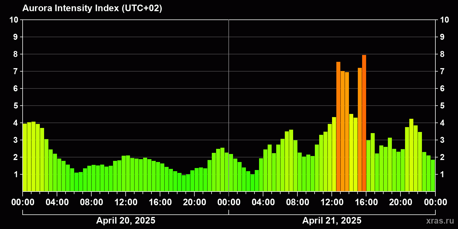 Auroral intensity index and the theoretically possible latitude of observations for nighttime in the Estern Hemisphere as of 2025-04-21 23:53 (end of day) local time