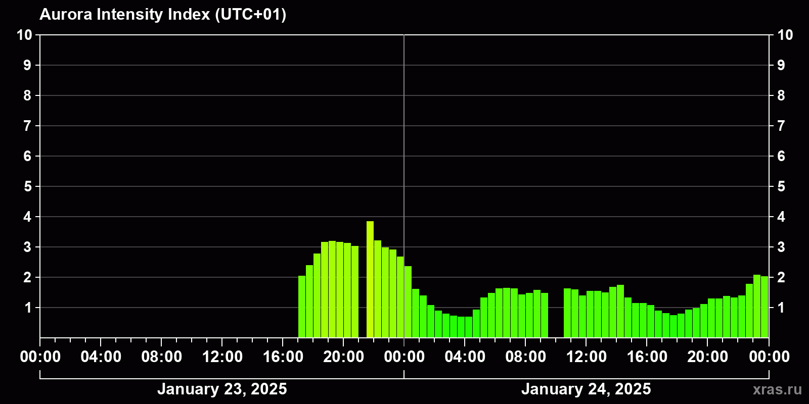 Auroral intensity index and the theoretically possible latitude of observations for nighttime in the Estern Hemisphere as of 2025-01-24 23:51 (end of day) local time